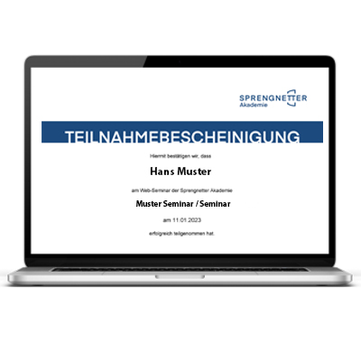 Diese Veranstaltung ist bei der Sprengnetter Akademie als Weiterbildung im Umfang von 0,75 Stunden anerkannt. Sie erhalten im Nachgang an die Veranstaltung eine aussagekräftige Teilnahmebescheinigung zur Vorlage bei der Gewerbebehörde oder weiteren Institutionen (Zertifizierung o.ä.).