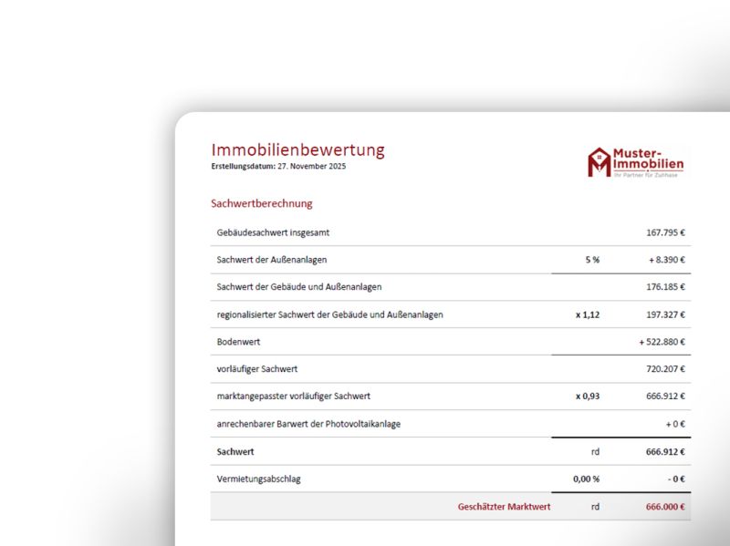 Die Bewertung erklärt die Gründe für den Wert. Nutzen Sie den detaillierten Berechnungsweg für Ihre Preisverhandlung mit dem Eigentümer.