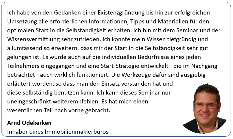 Doch unternehmerisches Denken und Handeln, sowie die Bewältigung der ersten rechtlichen und organisatorischen Schritte, sind weitere Aspekte auf dem Weg zu beruflicher Selbstverwirklichung. Die Fülle an Informationen und Besonderheiten können für Existenzgründer oftmals überwältigend sein. Daher wurde speziell für Gründerinnen und Gründer dieses Seminar konzipiert, um Ihnen einen Werkzeugkasten für den Start in die Selbstständigkeit zu geben.