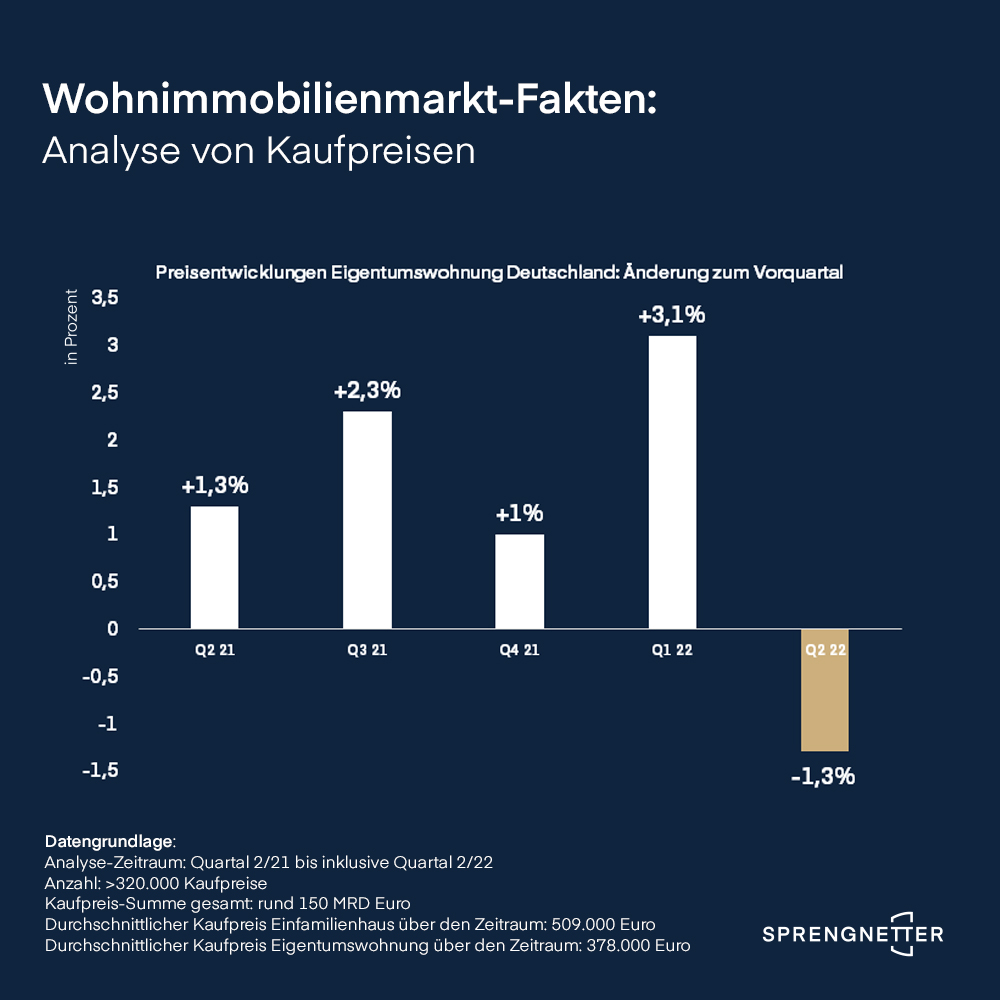 Die analysierten Kaufpreise decken den Zeitraum von Quartal 1/2021 bis zum Ende des Quartals 2/2022 ab. Im Ergebnis sind die Kaufpreise im letzten Quartal (Q2/22) gegenüber dem Vorquartal erstmals gefallen, und zwar im Teilmarkt Einfamilienhaus deutschlandweit um 0,8 Prozent, im Teilmarkt Eigentumswohnung deutschlandweit um 1,3 Prozent. Zum Vergleich: Im Teilmarkt Einfamilienhaus lagen die vorhergegangen Preissteigerungen recht konstant bei 2,7 Prozent (Q2/21 zu Q1/21), 2,2 Prozent (Q3/21 zu Q2/21), 3,1 Prozent (Q4/21 zu Q3/21) sowie 3,3 Prozent (Q1/22 zu Q4/21). Die Zahlen für die Kaufpreisentwicklungen von Eigentumswohnungen entnehmen Sie bitte den Grafiken.