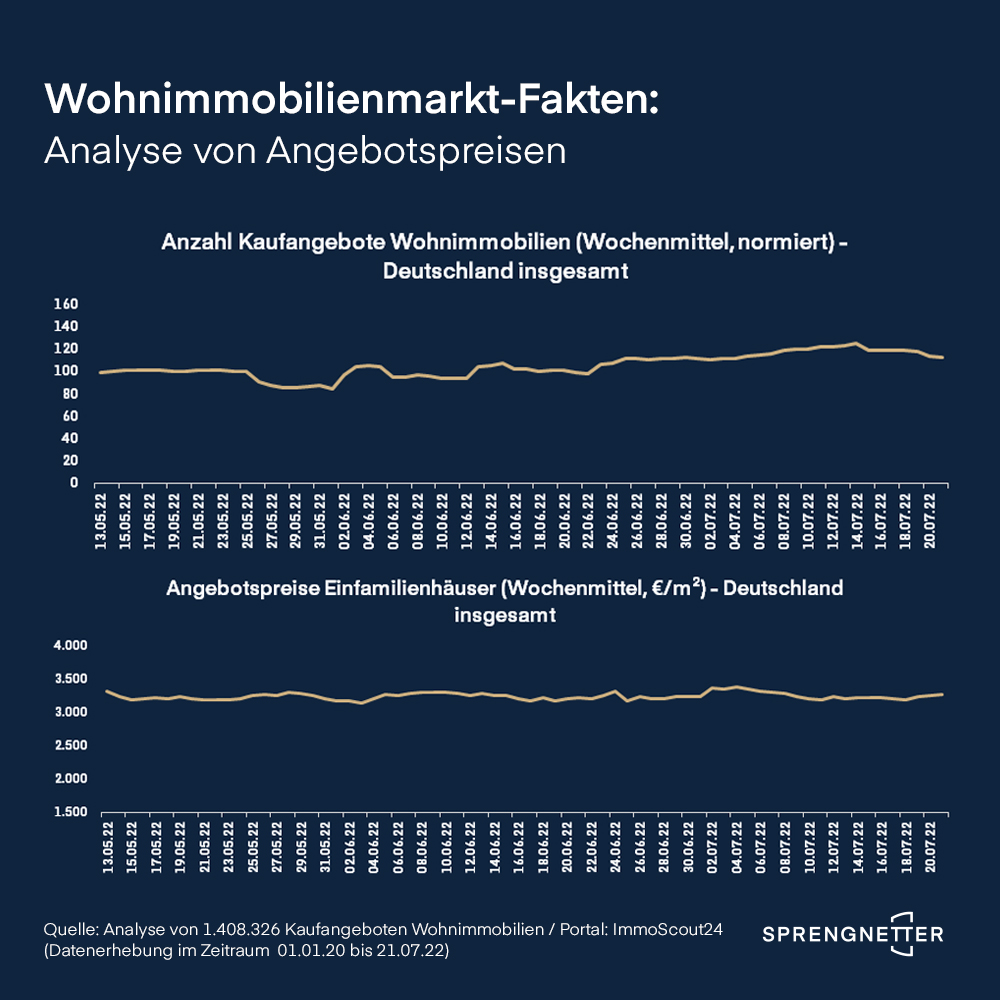 Sprengnetter liest seit dem 01.01.2020 regelmäßig die Angebotszahlen des deutschen Wohnimmobilienmarktes aus. Für diese Analyse wurden 2.145.117 Mietobjekte und 1.408.326 Kaufobjekte bis 20.07.2022- betrachtet. Darüber hinaus wurden über 320.000 Kaufpreise mit einer gesamten Kaufpreis-Summe von rund 150 Milliarden Euro im Zeitraum 01.01.2021 bis 31.06.2022 analysiert. In der Analyse selber wurden vorab gefilterte Kaufpreise verwendet, um offensichtliche Ausreißer zu eliminieren, etwa Eigentumswohnungen mit Wohnflächen größer als 200 m². Der durchschnittliche Kaufpreis von Einfamilienhäusern betrug über den analysierten Zeitraum übrigens 509.000 Euro, der Kaufpreis von Eigentumswohnungen 378.000 Euro.