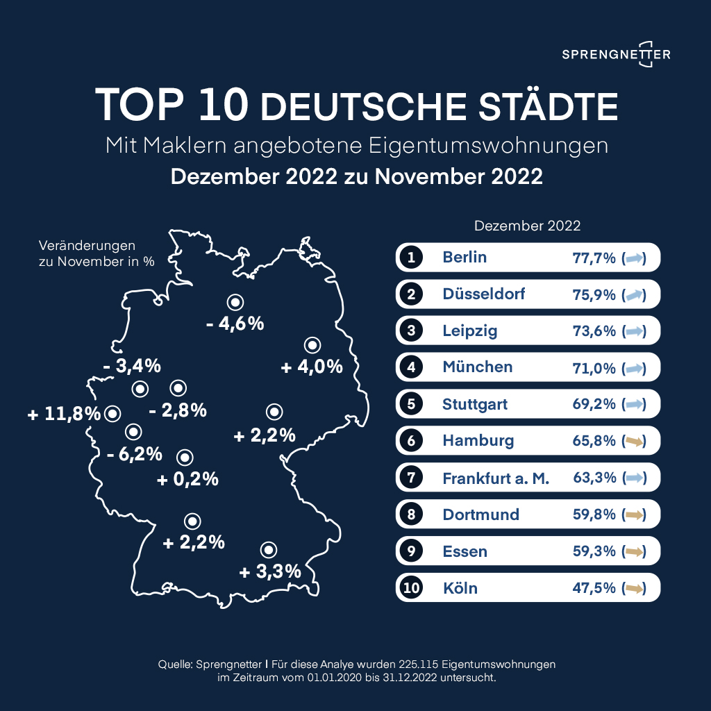Für diese Analyse wurden 225.115 Eigentumswohnungen in den Städten Berlin, Dortmund, Düsseldorf, Essen, Frankfurt am Main, Hamburg, Köln, Leipzig, München und Stuttgart im Zeitraum vom 01.01.2020 bis 30.12.2022 ausgelesen.