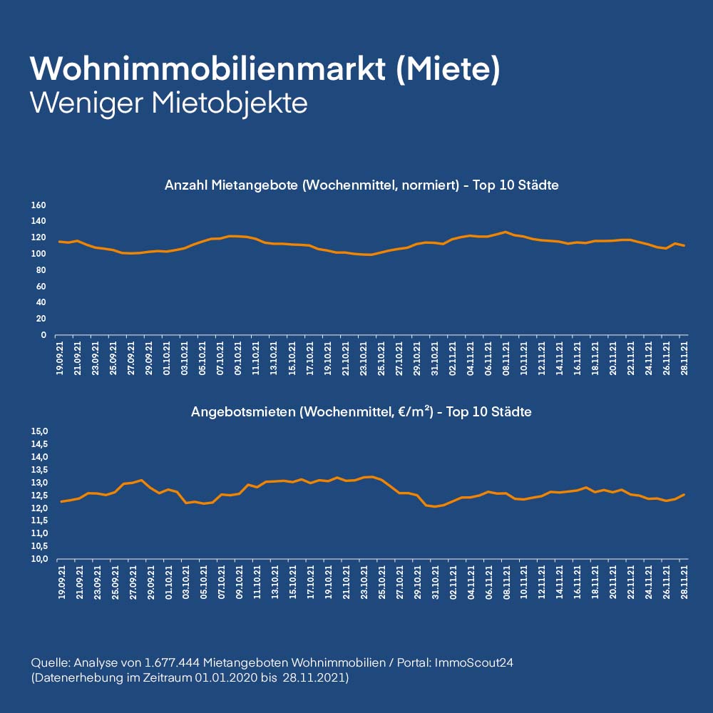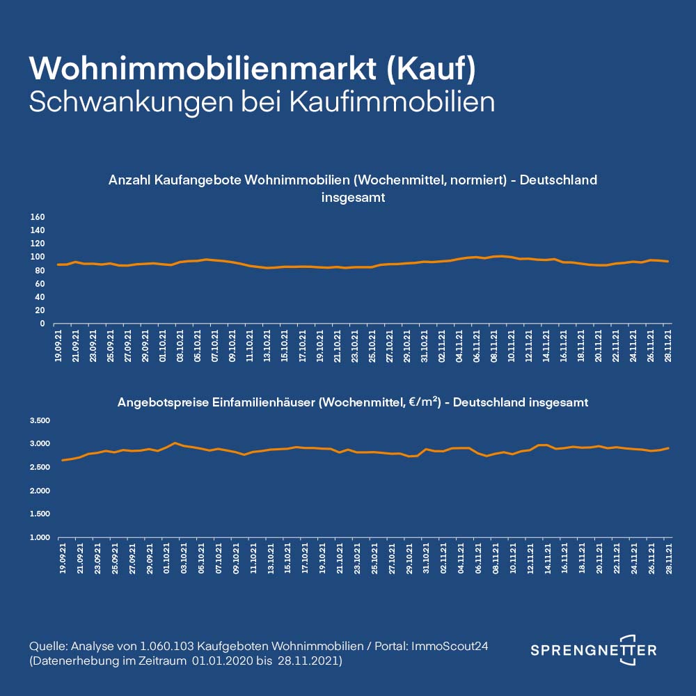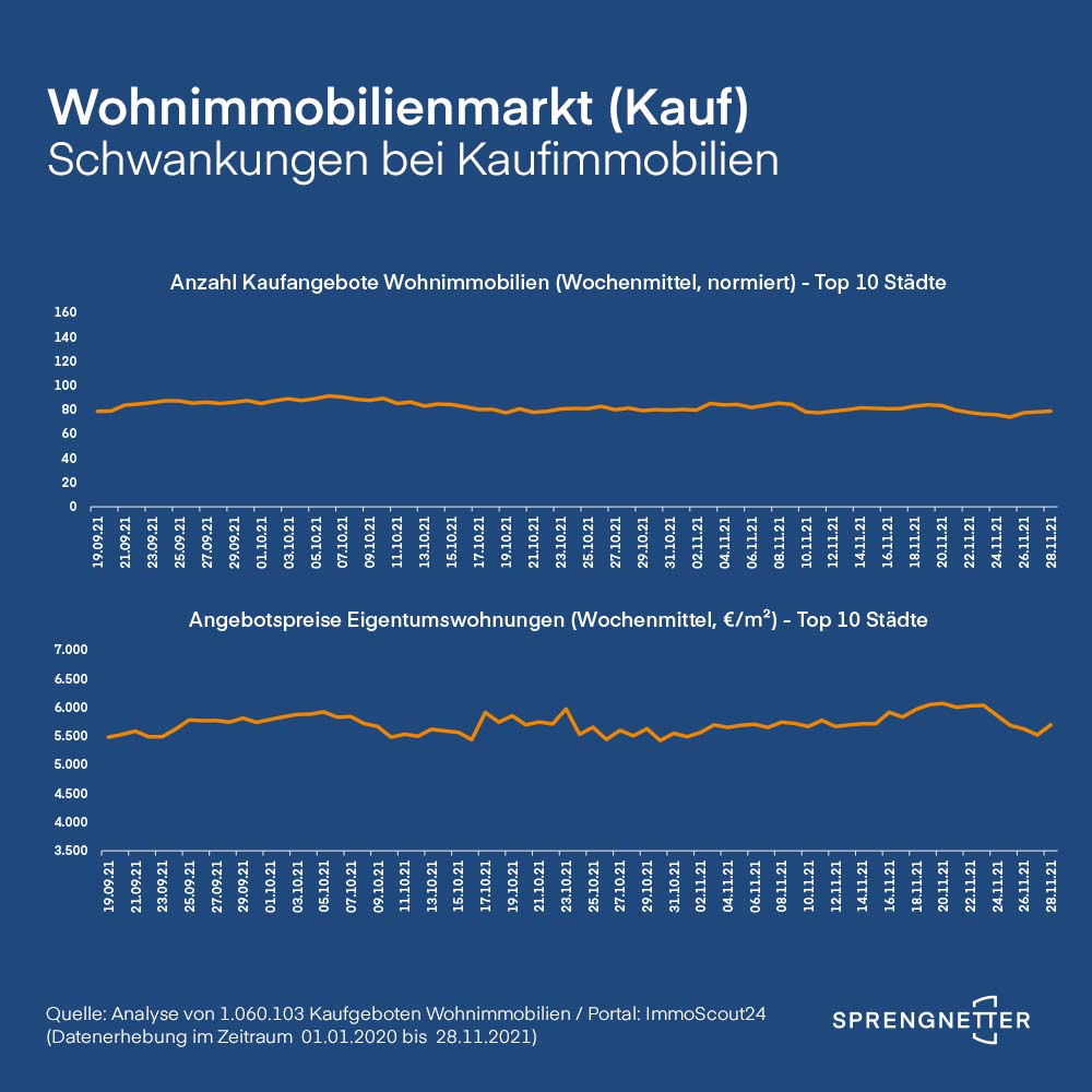 Die Preise zeigen nur leichte Schwankungen. So ist der Quadratmeterpreis in Deutschland (insgesamt) um 100 €/m² auf rund 2.900 €/m² gesunken, der Quadratmeterpreis in den zehn analysierten Großstädten ist mit rund 5.700 €/m² stabil zu dem gemessenen Wert am 14.11.21.