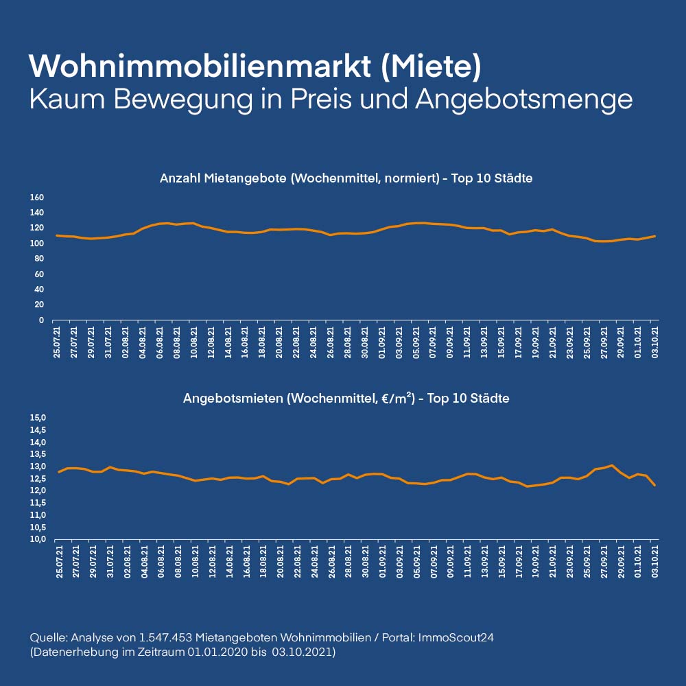 Die Angebotsmenge auf dem Mietmarkt fällt dahingegen leicht ab. Die Indizes stehen in den Städten bei 109 (Wert am 19.09.21: 118) und in Deutschland insgesamt bei 124 (Wert am 19.09.21: 128).